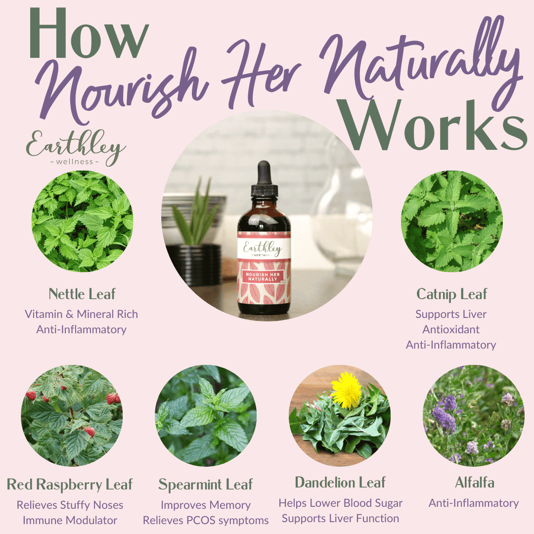 Women do so much and that requires the right support to keep them going. Nourish Her Naturally is formulated with nettle leaf, red raspberry leaf, dandelion leaf, catnip leaf, alfalfa leaf, and spearmint leaf – herbs that help balance hormones, promote energy and calmness, and provide your body with the essential vitamins and minerals you need to take charge of your day.