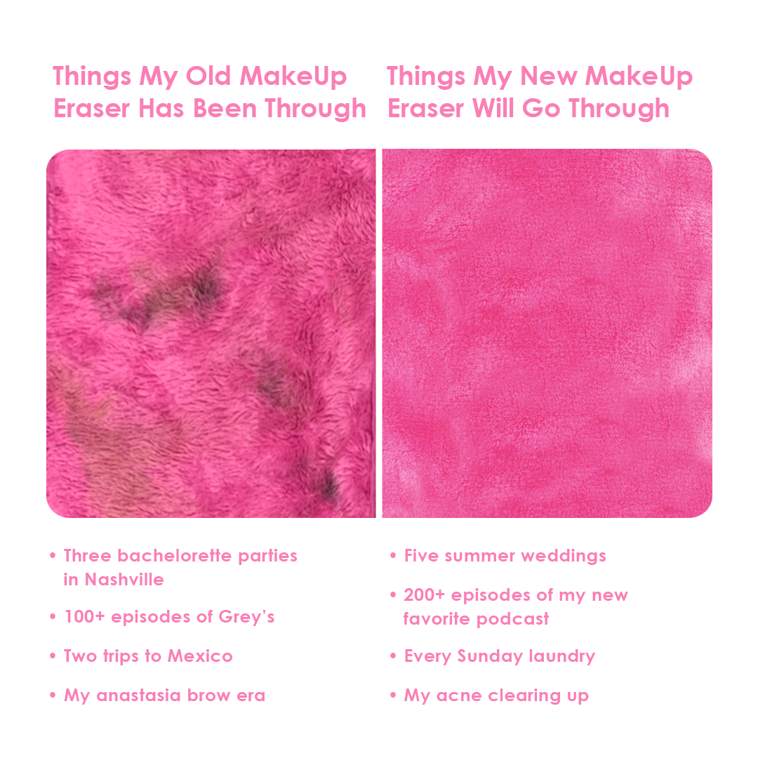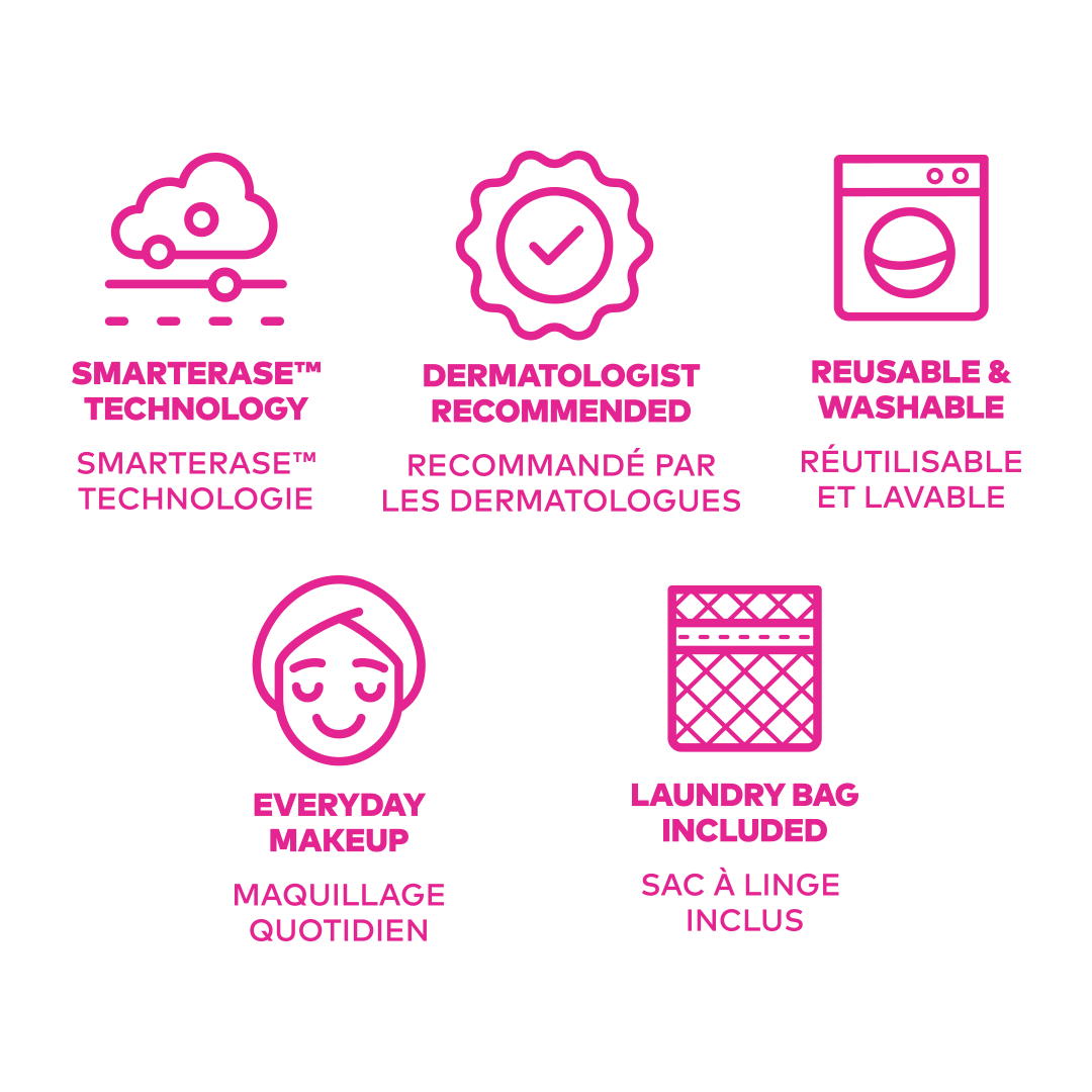 Includes: (7) daily cloths 5" x 4" & laundry bag Erase all makeup with JUST WATER™ including waterproof.